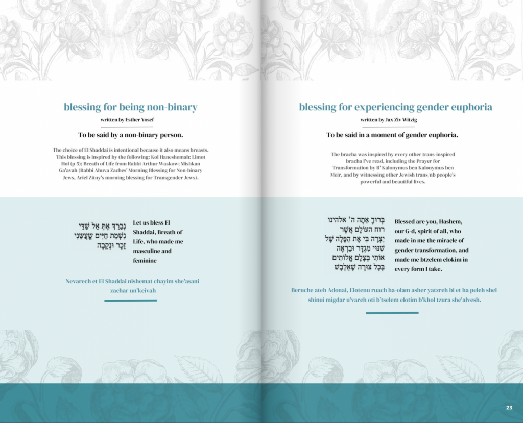 The Trans Halakha Project seeks to curate existing and developing resources that have been created for trans Jews, by trans Jews and engage trans & non-binary people in the creation of specific rituals and blessings. This work is expressed in Tefillat Trans: Blessings and Rituals for Trans Lives.